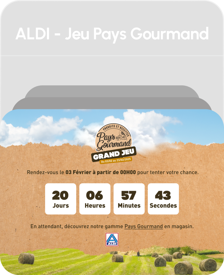 Le « Jeu Pays Gourmand » est un jeu lancé par ALDI avec des questions sur la marque « Pays gourmand », et des lots comprenant des bons d’achat et un an de courses chez ALDI.